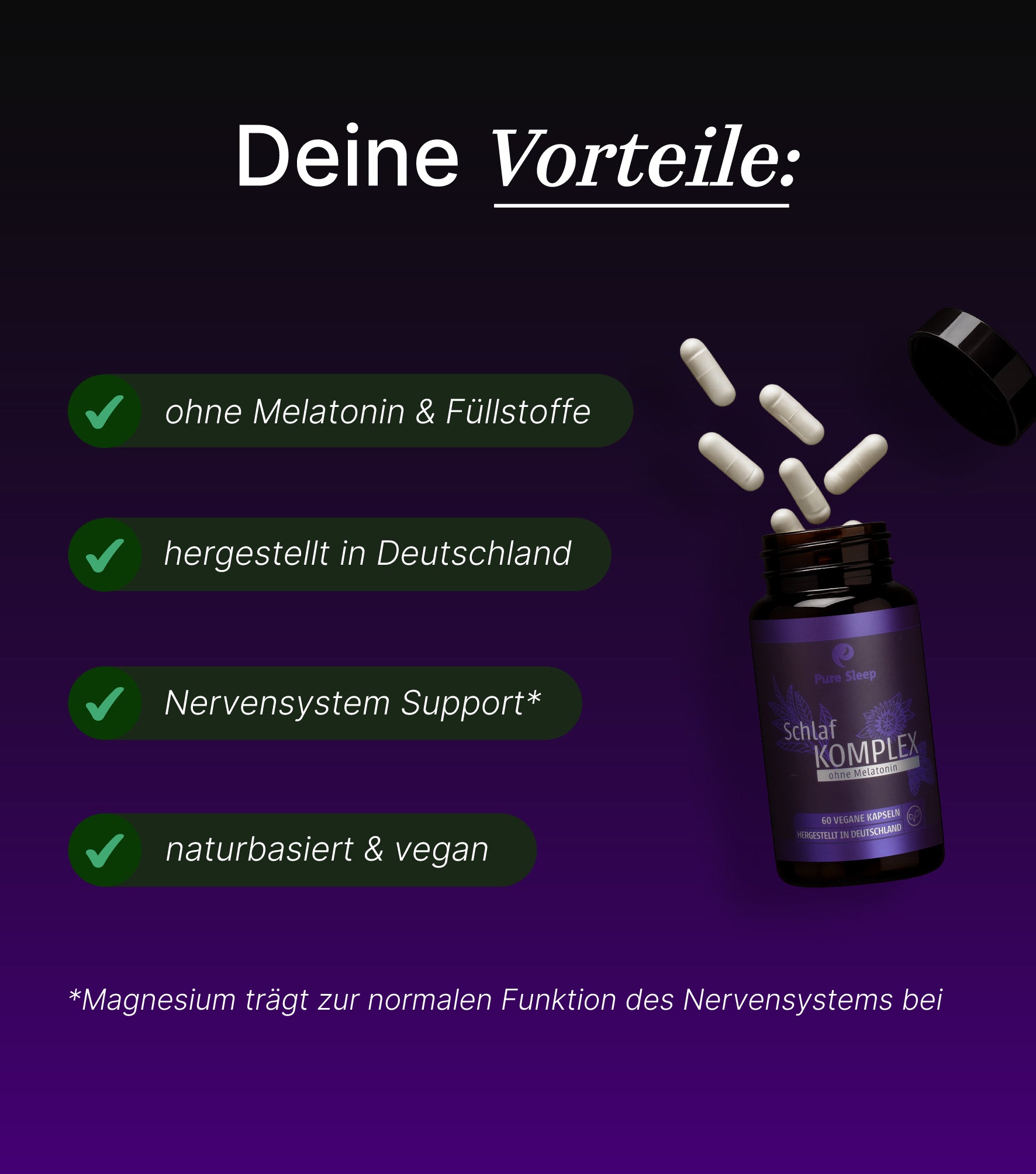 Magnesium trägt zur normalen Funktion des Nervensystems bei. Viele Nutzer berichten hier schon von erholsamerem Schlaf und besser empfundener Regeneration.