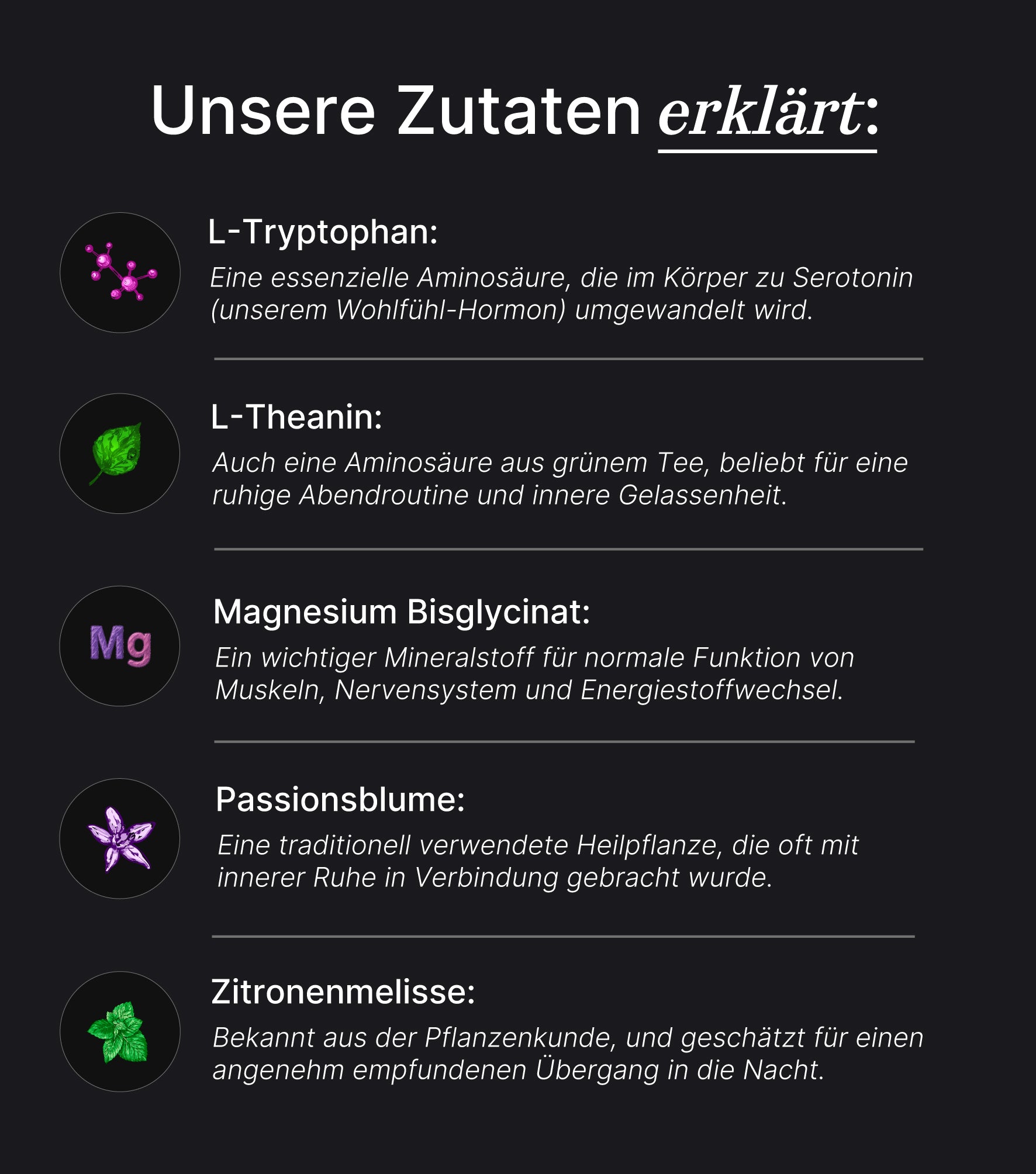 Ebenfalls eine Aminosäure, die in Studien mit Entspannung und besser empfundener Schlafqualität in Verbindung gebracht wird.